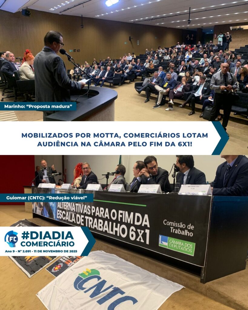Audiência Pública que debateu “Alternativas para o Fim da Escala 6×1”, nesta segunda-feira, 10, em Brasília, contou com expressiva participação de Sindicatos Filiados à Fecomerciários. Mobilizados pelo presidente da Federação, da CNTC e Deputado Federal, Luiz Carlos Motta, comerciários e práticos de farmácia lotaram o Auditório Nereu Ramos (Câmara), no qual foram expostos pontos a favor dessa redução da jornada semanal de trabalho e contra, conforme manifestações patronais.